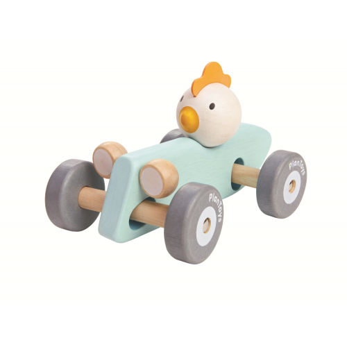 Dieses Auto mit einem Küken am Steuer wird Groß und Klein unterhalten. Dank seiner abnehmbaren Räder kann es Türschwellen und Treppen überwinden.