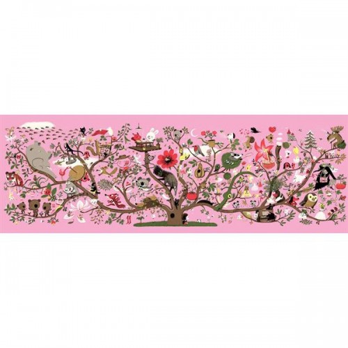 Horizontales Puzzle eines großen blühenden Baumes auf rosafarbenem Hintergrund. Ein Puzzle mit 200 Teilen, das eine Quelle der Flucht und Kontemplation für einen Moment des Bauens und der Entspannung sein wird.
