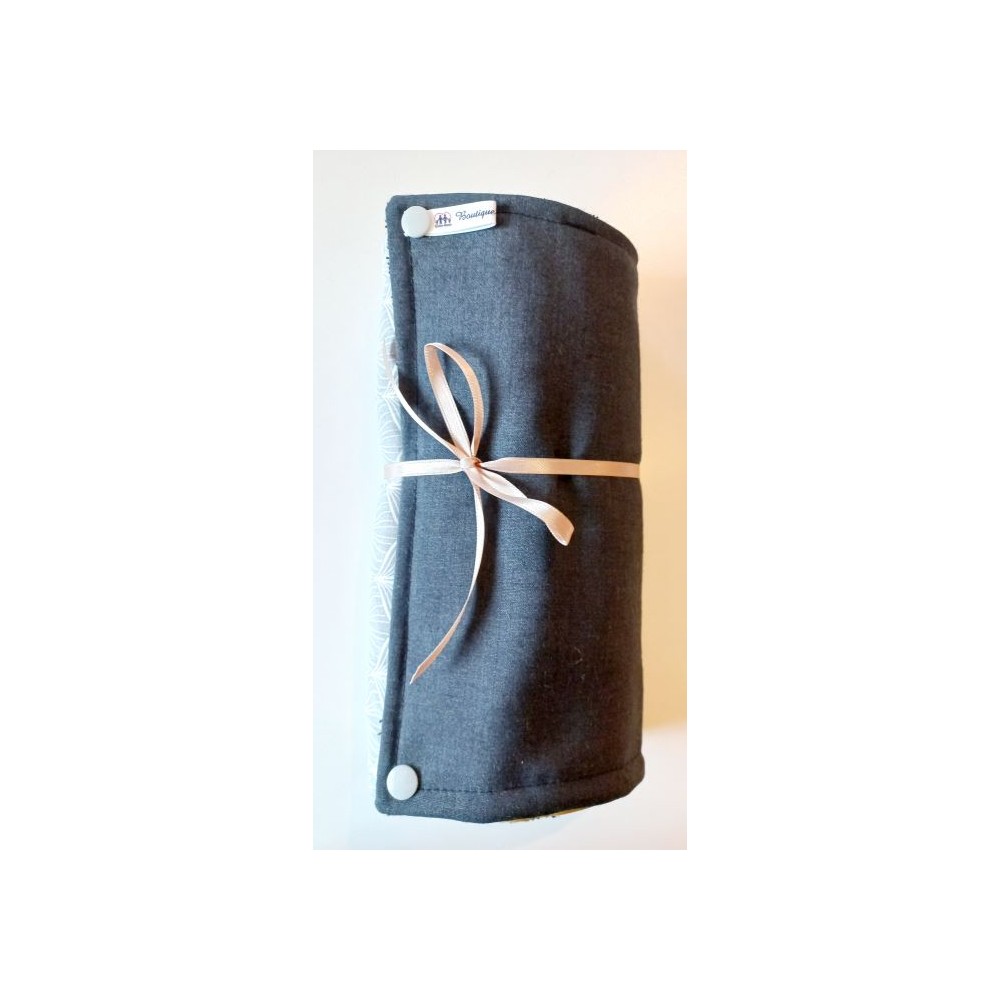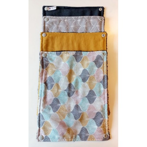 Das waschbare Küchenhandtuch besteht aus acht 25 x 18 cm großen Blättern, die alle mit einem Druckknopf befestigt sind. Eine Seite ist aus einfarbiger oder gemusterter Baumwolle und eine Seite aus Frottee.