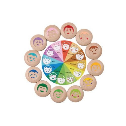 Memospiel mit 24 Holzteilen und 12 verschiedenen Emotionen mit einer Scheibe in Englisch, Französisch und Deutsch und einer Anleitung auf der Rückseite in Französisch und Englisch.