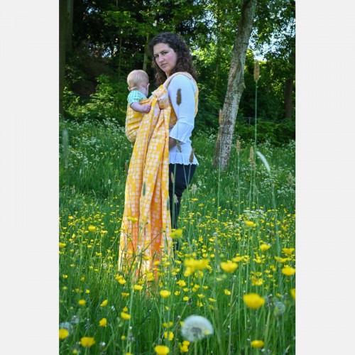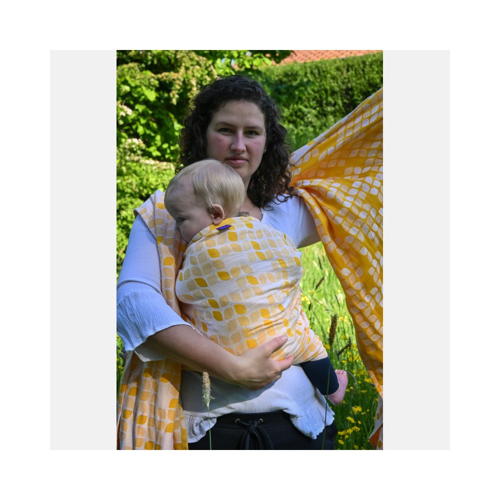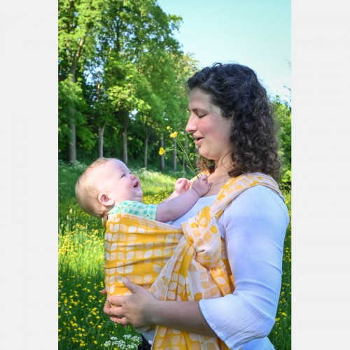 Waschempfehlung: Wasche den Sling vor dem Gebrauch, indem du die Ringe schützt. In der Maschine oder mit der Hand, ohne Weichspüler und mit wenigen Umdrehungen pro Minute. Trocknen Sie das Baby flach liegend.