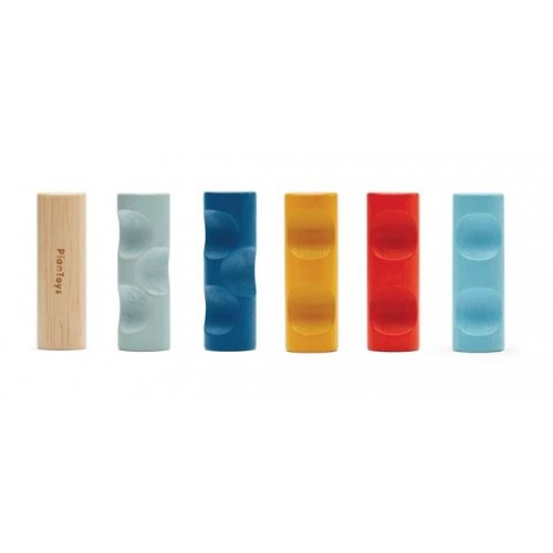 Build your own town with these wooden building bricks. The set includes 24 bricks in 8 different shapes and 5 colours.