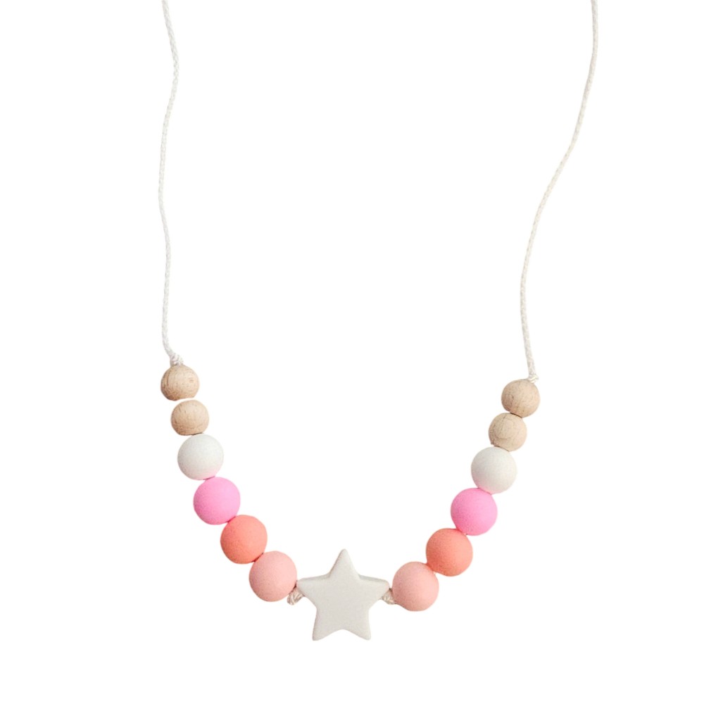 Que ce soit lors de la tétée ou en portage, ce collier occupe les petites mains de bébé en pleine découverte.