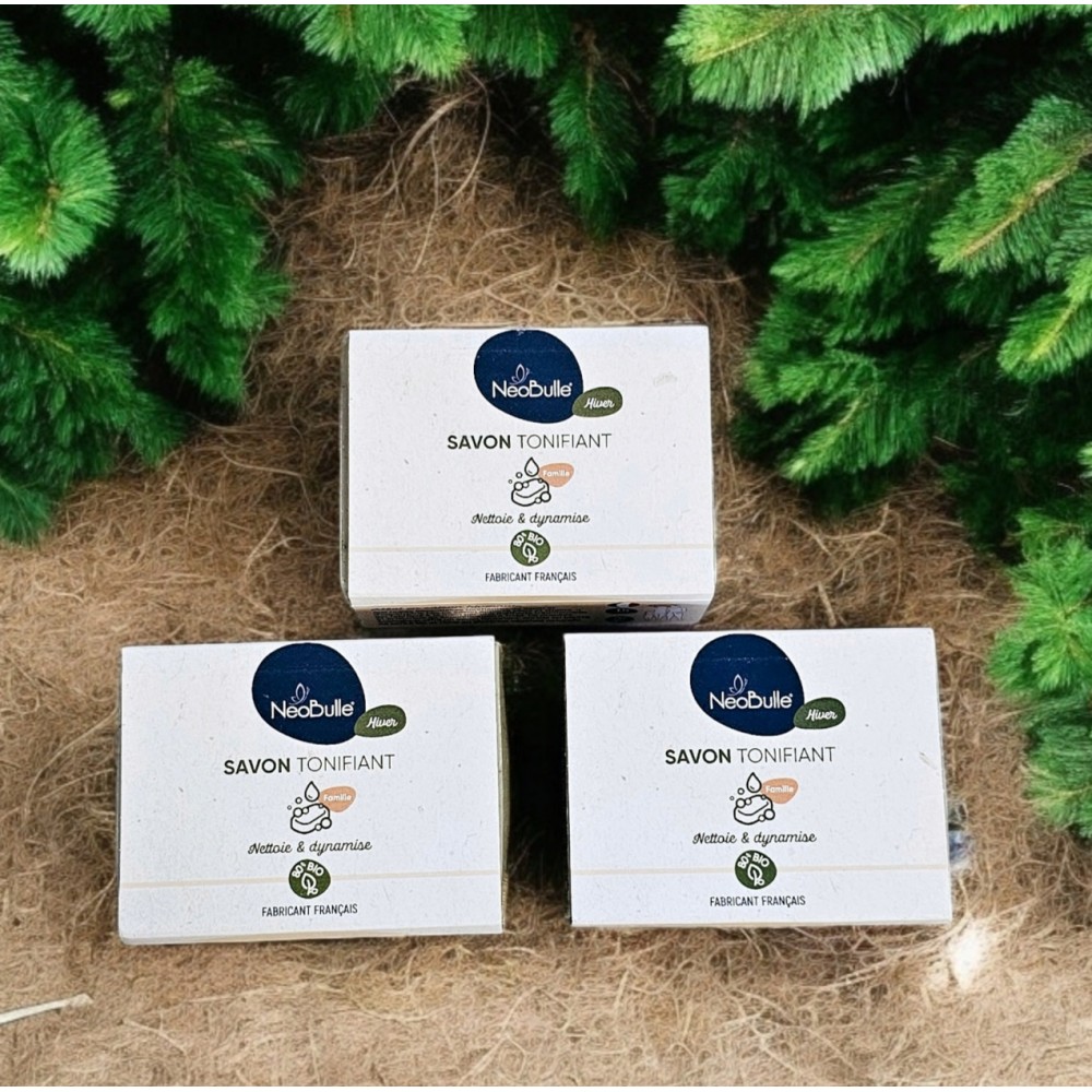 Aux huiles essentielles tonifiantes de Sapin et d'Eucalyptus Bio, ce savon apporte peps et vitalité. Il est fabriqué à la main par une méthode traditionnelle et artisanale de saponification à froid. Ce procédé écologique offre un savon hydratant, enrichi en beurre de Karité Bio, et riche en glycérine végétale naturelle.?