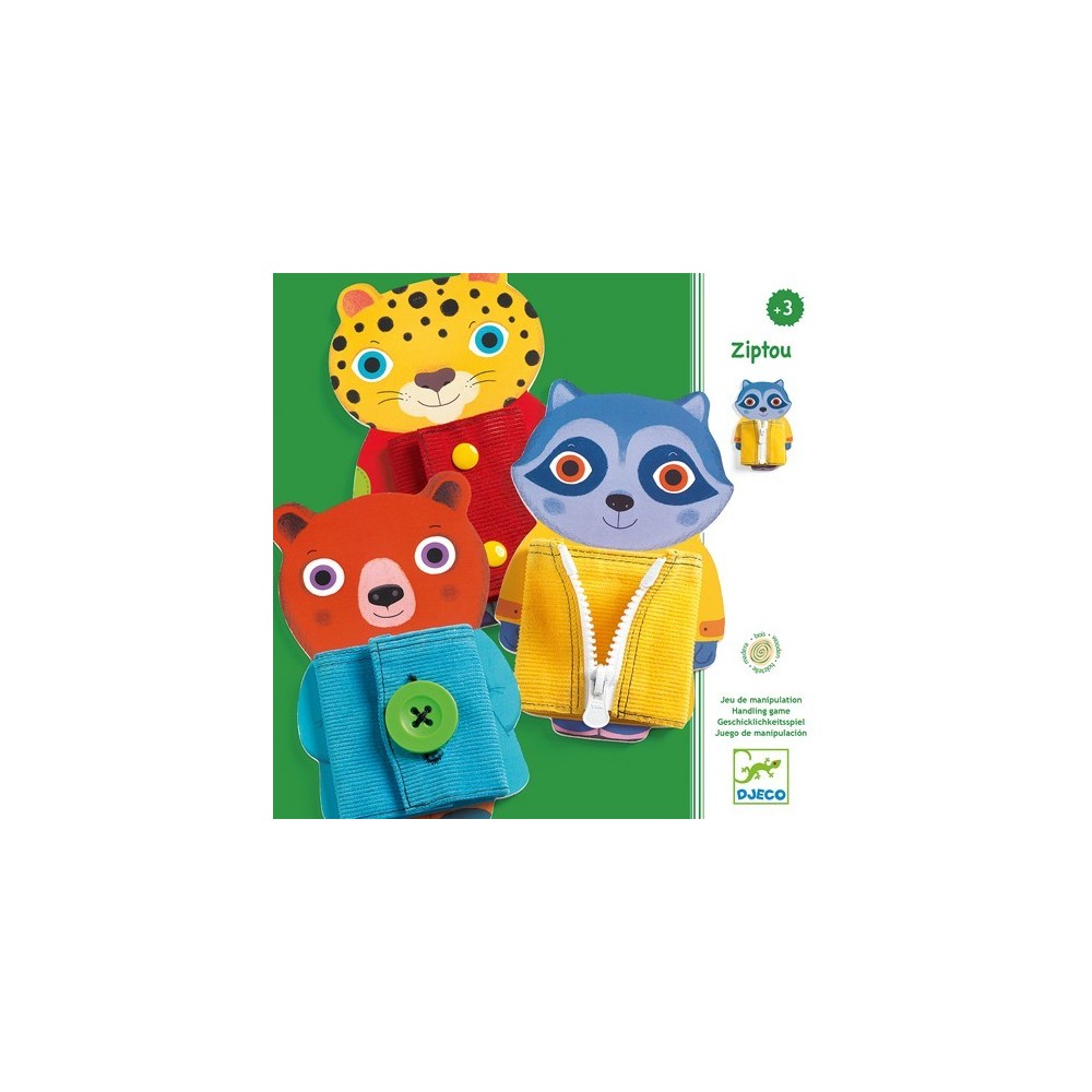 Un gioco di manipolazione per aiutare i bambini a sviluppare la loro destrezza, con 3 animaletti sui quali possono abbottonare, far scorrere la zip e chiudere i bottoni a pressione.