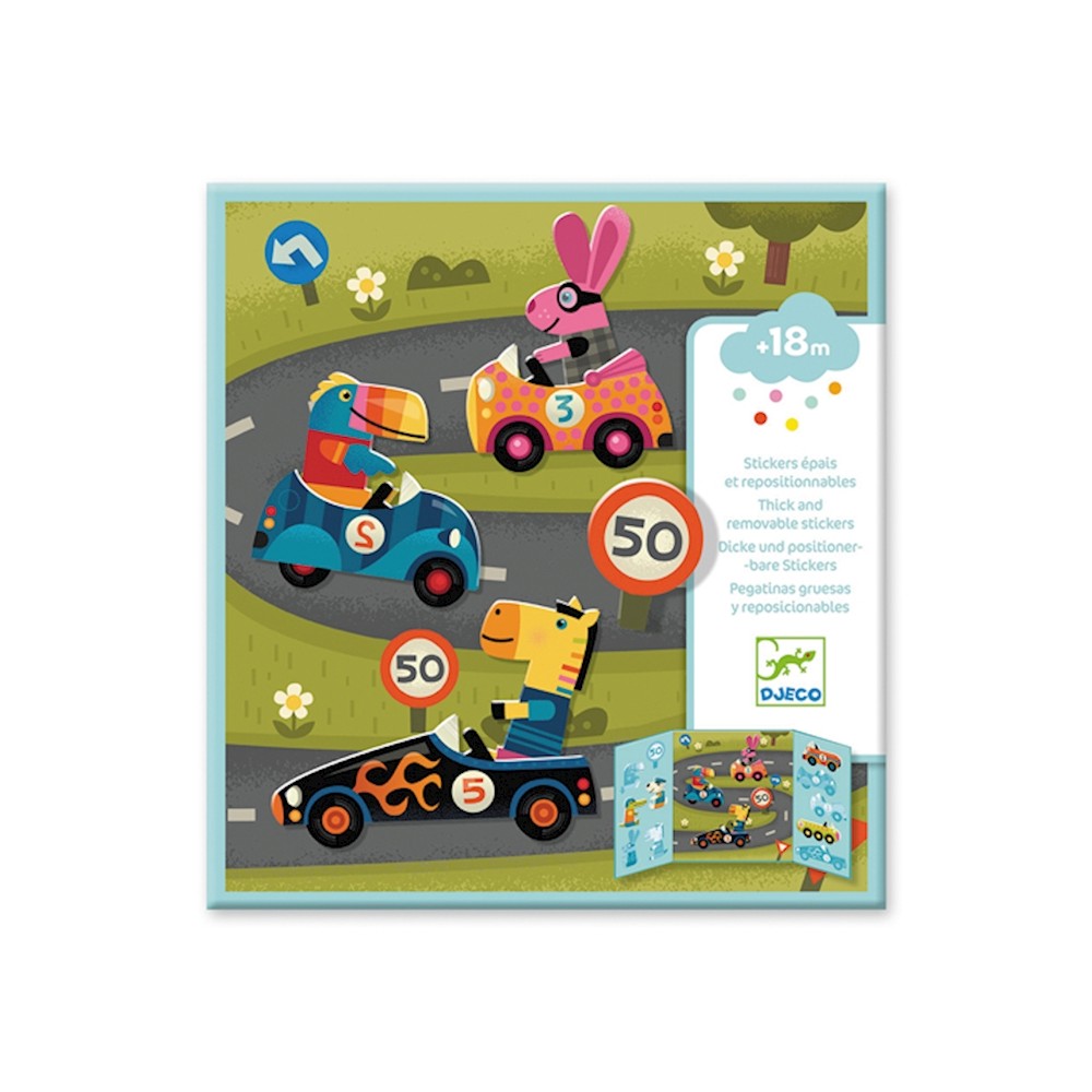 Una decorazione a forma di pista e adesivi spessi e riposizionabili, per divertirsi durante le attese o i viaggi.