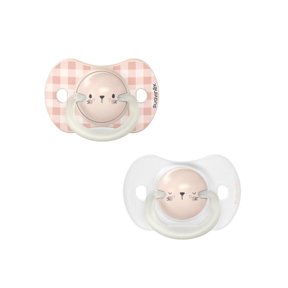 Set di 2 succhietti Suavinex SX Pro 0-6 mesi. Uno per il giorno (con anello fosforescente) e uno per la notte, che si illumina al buio per una facile visibilità.